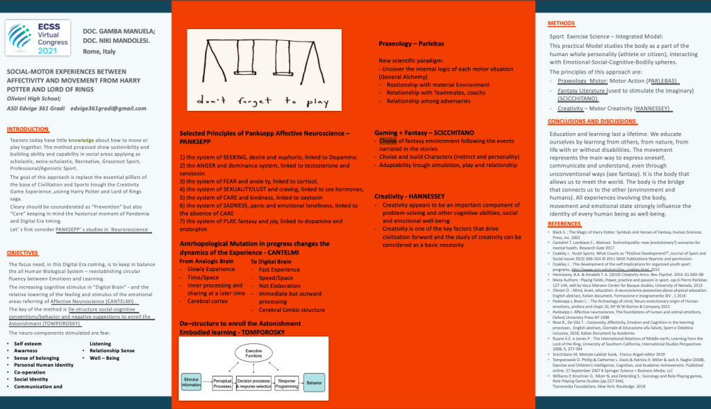 ECSS PARIS 2023 CLEMSON UNIVERSITY THE NATURE OF PLAY MARZO 2022 ECSS VIRTUAL CONGRESS 2021 – Social motor experience between affectivity and movement from Harry Potter and Lord if the ring